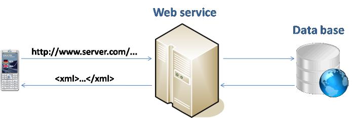 The newyorktime sample(enclosed within the JM-Mobile Editor) is a good example for this kind of application. This application will have always the live info from the New York Time database. The image below represent a such system architecture: