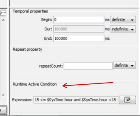 You can use the Runtime Active Condition editing on the Temporal Attributes panel to specify the condition activation of an object.